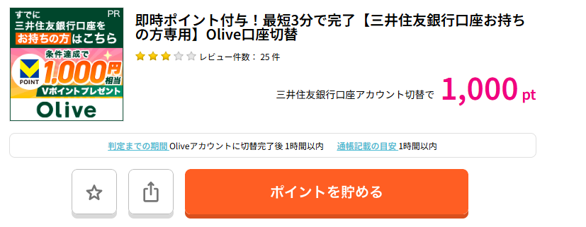 銀行口座新規作成とOliveの切り替えでもらえるポイント数が異なるみたいです。